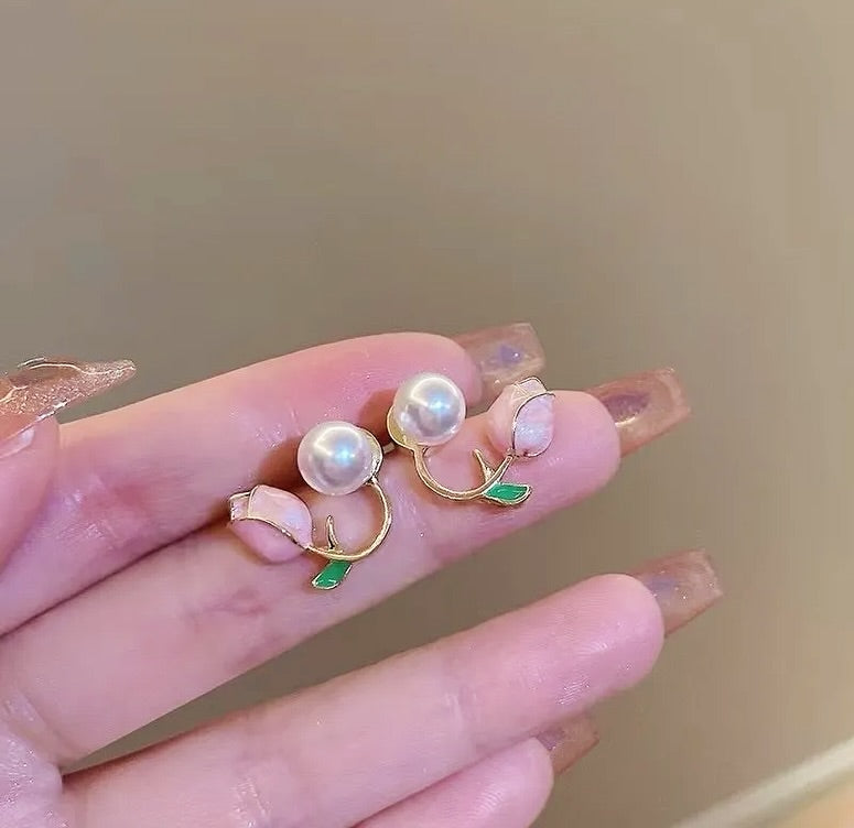 Elegant Pink Tulip Flower Pearl Stud Earrings